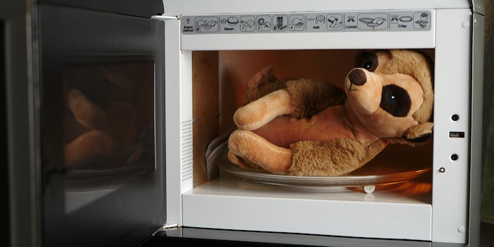 Ebenfalls unübersehbar gross ist der Hinweis: Kinder sollen sich beim Aufwärmen helfen lassen. Und natürlich sollte die Mikrowelle sauber sein, damit der Lavendelduft nicht von altem Fett überdeckt wird oder Käsereste im Plüschfell kleben. Mein Garraum ist eher klein, weshalb sich das Tierchen mehrfach verkeilt und ich nachjustieren muss.