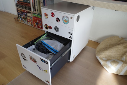 Kram, den ich nicht brauche, packe ich in einen Songmics-Korpus unter dem Schreibtisch. Dort herrscht mehr Chaos als Ordnung, aber das sehe ich zum Glück nur kurz, wenn ich eine Schublade aufmache. Weil der Korpus ultrahässlich ist, klebe ich ihn fortlaufend mit Stickern voll.