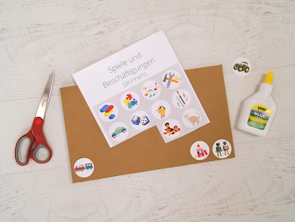 Schritt 2: Suche dir aus dem Internet Symbole für Spielideen, mit denen sich dein Kind draussen oder drinnen gerne beschäftigt. Schneide sie aus und klebe sie dem Rand entlang auf die Tafel. Gerne kannst du auch die von mir verwendeten Ideen als PDF herunterladen. Darin findest du drei Seiten mit Spielideen und Gefühlskarten.