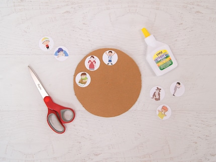 Schritt 3: Die Gefühlskarten schneidest du ebenfalls aus und klebst sie auf den Kartonkreis.