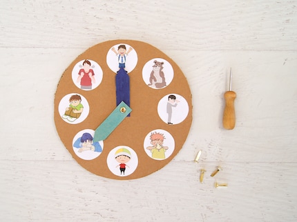 Schritt 6: Mit der Rundkopfklammer befestigst du die Zeiger in der Mitte der Uhr.
