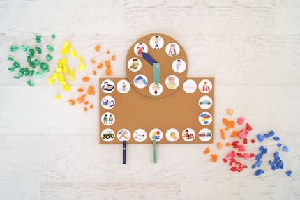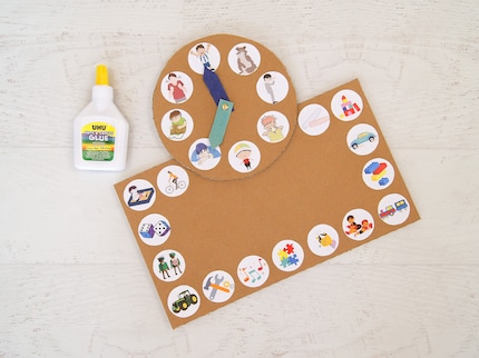 Schritt 7: Klebe die Uhr auf den rechteckigen Karton mit den Spielideen und fertig ist die Gefühlshilfe für dein Kind.