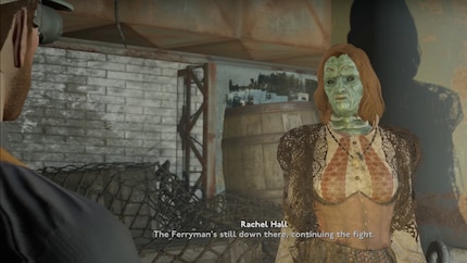 Das Themsenvolk ist ein Fischvolk, das es im «Fallout»-Universum so noch nicht gegeben hat. Als Fan der Erzählung «Schatten über Innsmouth» von H. P. Lovecraft bin ich von den sprechenden Fischmenschen direkt begeistert und möchte alles in meiner Macht Stehende tun, um sie zu unterstützen. Meine Hilfe hat das friedliche Themsenvolk bitter nötig: Ich rette den Fährmann kurz vor seinem Tod, indem ich die Blutegel und Ratten in seiner Nähe bekämpfe. Als Belohnung für meine Bemühungen erfahre ich mehr über die Fischmenschen. Deren organische Einführung ins Spiel könnte von Bethesda selbst stammen.