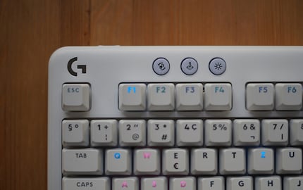 Oben an der Tastatur hat Logitech praktische Knöpfe angebracht: je einen für die Bluetooth-Verbindung, den Spielmodus, welcher Windows- und Menütasten blockiert, und die Helligkeit. Dazwischen gibt’s eine LED-Anzeige, ob Caps Lock aktiviert ist und eine für den Akku.