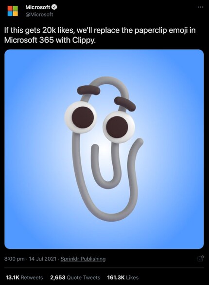 Microsoft droht, damit, seine nervig-liebenswürdige Clippy-Figur, bei uns als Karl Klammer bekannt, zurückzubringen. Der Software-Gigant behauptet, er werde das Büroklammer-Emoji Microsoft Office durch Clippy ersetzen, wenn der untenstehende Tweet 20 000 Likes erhält.