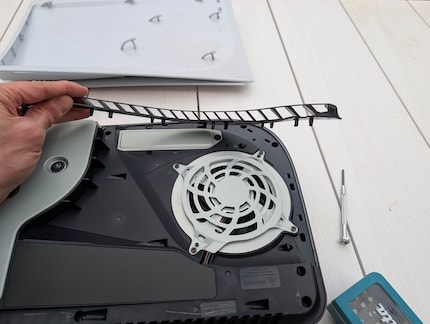 Nun siehst du bereits den Lüfter. Bevor du ihn abschrauben kannst, musst du bei der Original-PS5 noch den Lüftereinlass abnehmen. Das ist das halbrunde, gerillte Element oberhalb des Lüfters. Du kannst es einfach hochziehen. Sei vorsichtig, dass du es nicht auseinanderbrichst.