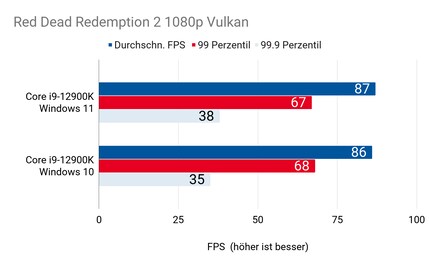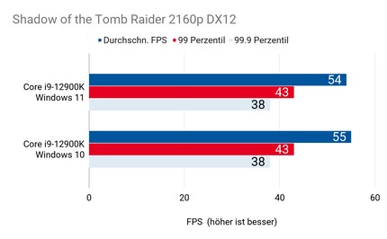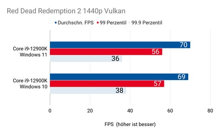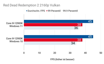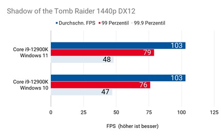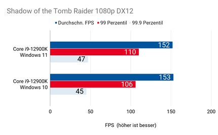 Hab ich mir’s doch gedacht: Einzig in «Civilization 6» ergibt sich ein relevanter Unterschied. In «Shadow of the Tomb Raider» und «Red Dead Redemption» liegt der 12900K unter Windows 10 und 11 beinahe immer gleichauf – sogar bei den Frametimes in Perzentilen.