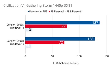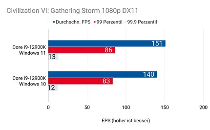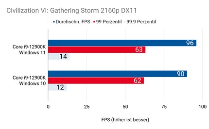 Beim CPU-intensiven Game «Civilization 6» ergeben sich grosse Unterschiede. Bei 1080p- und 1440p-Auflösung ist der 12900K unter Windows 11 ganze 7 Prozent schneller. Bei 2160p-Auflösung 6,5 Prozent. Die Auflösung spielt bei diesem Spiel also nur eine kleine Rolle. Das liegt daran, dass die CPU sehr viele Berechnungen übernehmen muss. Der Thread Director arbeitet in Windows 11 offensichtlich zuverlässiger als in Windows 10. Das dürfte bei allen Games so sein, bei denen die CPU ein grosse Rolle spielt.