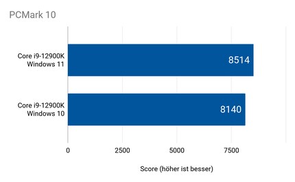 Endlich ein grösserer Unterschied, möchte ich sagen: Im PCMark10 schneidet der Alder-Lake-S-Prozessor unter Windows 11 4,5 Prozent besser ab als unter Windows 10.