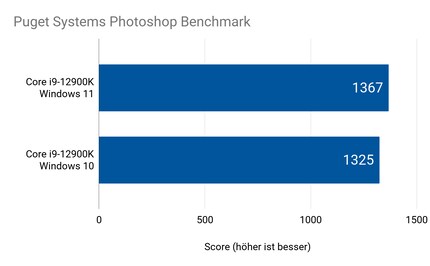 Nicht 1, nicht 2, sondern 3 Prozent beträgt der Leistungsunterschied in Photoshop. Erneut läuft der 12900K in Windows 11 schneller als in Windows 10.