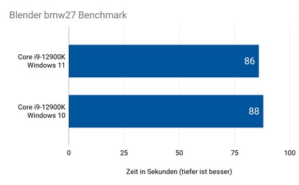 Zwei Sekunden oder rund 2 Prozent schneller ist der 12900K unter Windows 11. Das ist erneut ein sehr geringer Unterschied. In Realität wirst du kaum bemerken, ob die Szene innert 88 oder 86 Sekunden gerendert wird.