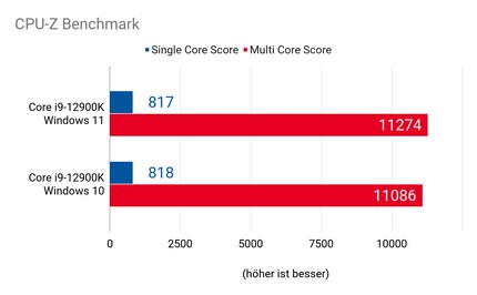 Auch beim CPU-Z Benchmark sind die Unterschiede gering. Im Single Core ist der Alder Lake-S Chip unter Windows 10 gar schneller als unter Windows 11. Der Unterschied beträgt jedoch nicht einmal ein halbes Prozent. Beim Multi Core ist es umgekehrt: Hier erreicht der Chip unter Windows 11 das bessere Resultat. Die Differenz beträgt aber gerade mal 1,5 Prozent.