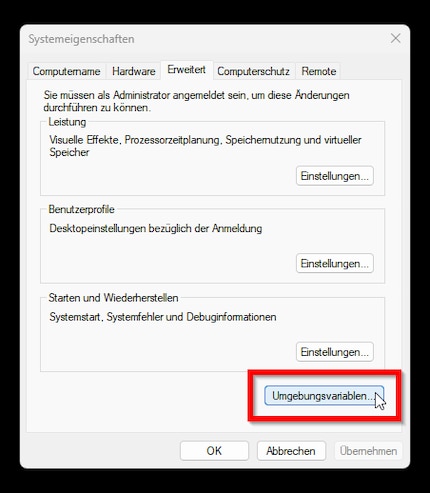 Darauf öffnet sich der «Erweitert»-Tab der Systemeigenschaften. Dort klickst du auf «Umgebungsvariablen...».