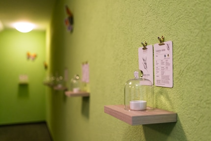 Entlang der Stufen sind an der Wand Regalbretter befestigt, auf denen kleine Glasglocken stehen. Darunter eröffnen sich ganze Aromalandschaften: ätherische Öle aus der ganzen Welt, ein Auszug aus dem Portfolio der Firma. Sie entführen mich und Ressortleiter Oliver Fischer, der heute als Fotograf im Einsatz ist, in ganz unterschiedliche Duft- und damit zugleich Gefühlswelten.