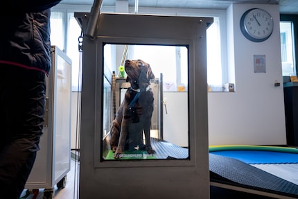 While Saida salivates, Reinmuth-Hürzeler presses the start button unnoticed. The treadmill begins to turn under the dog’s paws. Supergirl, as her pink collar says, takes off. Carried by the water, she slowly moves forward. Her joints are freed up and her muscles work against the water resistance. She keeps her balance with her tail swinging back and forth.