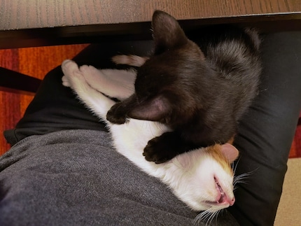 My senior cat Lopi, who we unfortunately had to put to sleep at the end of April, also demanded attention and liked to sit on my lap as soon as I sat down. But the two little ones want to be even closer. They greet me with loud purring, lick me and nudge me with their noses. Is there a better feeling?