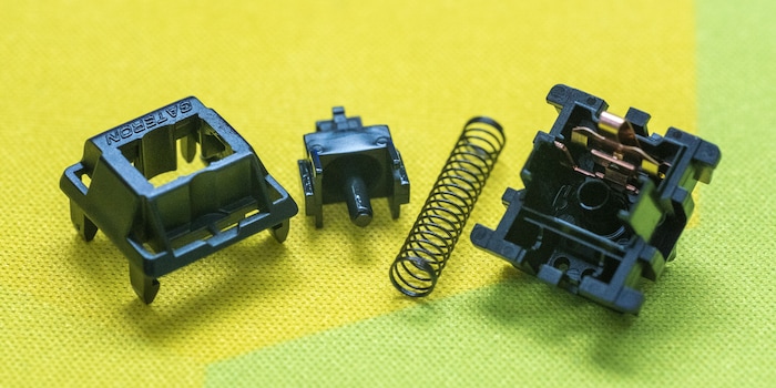 Show allA mechanical switch, as installed in most keyboards, is based on five components: stem, spring, upper and lower housing parts, and contact blade. The stem is the part that moves up and down inside the switch. It is attached to a spring that returns it to its original position. The stem moves between the upper and lower housing parts. The upper part is plugged onto the lower one. The lower part houses the contact blade. This is the metal part that closes the electrical circuit and registers the keystroke.