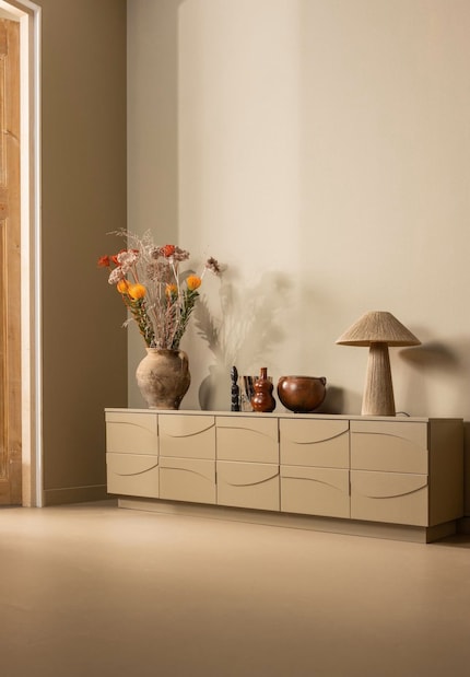 I’ve found chests of drawers and TV furniture in our range in many different styles and that are more than just a functional storage solution. There are lacquered, veneered doors in light and dark shades, with patterns, decorations or reliefs. I like models with round elements the most because they break up the rigid lines of the rectangular storage space. Take a look.