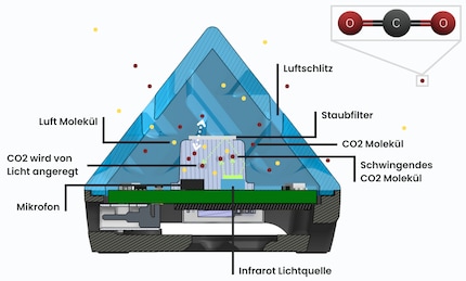 Let’s get over its shape and focus on its function. The SCD40 chip in the pyramid measures the number of CO₂ particles in the air every five seconds. It sits on a small circuit board that controls an LED. This illustration (in German) shows exactly how it works.