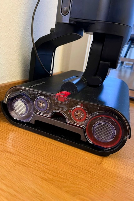 Although the cleaner tips the scales at just under five kilogrammes, it’s comfortable to hold and easy to move around. With one battery charge and less than one tankful of water, I can cover all 70 square metres of my flat. Assuming the place isn’t sporting too many hefty stains, that is. The WashG1’s strong suit is definitely hardwood flooring. Once I’ve cleared any cables out of the way, I can even reach dust under the furniture.
