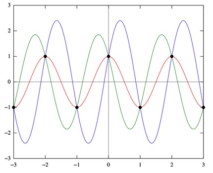 Le théorème s’applique cependant que si toutes les fréquences au-dessus de 22 050 Hz sont filtrées. Vous le voyez dans le graphique suivant. Les points noirs représentent les échantillons. Trois courbes de différentes fréquences relient ces échantillons. Vu que toutes les trois courbes passent par les échantillons, on ne sait pas dès le départ quelle est la fréquence correcte.