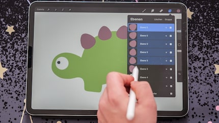 Vous y êtes presque. Il te reste maintenant à ajouter un peu de structure et de motifs à ce petit bonhomme. Pour éviter de peindre au-delà des formes, il existe le verrouillage alpha. Vous l'activez en faisant glisser la forme du dino vers la droite avec deux doigts. Vous pouvez également cliquer sur le calque et sélectionner Verrouillage alpha. Maintenant, seul le dino peut être peint