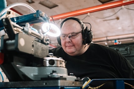 Le polymécanicien Nathan Reist, qui travaille dans l’usinage, admirait déjà le bâtiment de PB Swiss Tools à Wasen lorsqu’il allait à l’école : « Je le voyais depuis la cour de récréation et je me disais déjà à l’époque que je voulais y entrer un jour ». Cela fait près de six ans qu’il en a fait son quotidien. Nathan est presque l’employé le plus jeune[MG1]. Son collègue Roland Rubin, par exemple, est dans la maison depuis 44 ans. On le voit ici devant un tour CNC moderne qui fabrique les têtes du produit standard le plus cher, le maillet sans rebond. Il a commencé à travailler chez PB Swiss Tools juste après l’école de recrues et prendra sa retraite en novembre. « Après, je veux enfin faire un grand voyage. Dans l’idéal, j’aurais voulu prendre le transsibérien de Saint-Pétersbourg à Vladivostok, mais ce n’est malheureusement pas possible pour le moment. Ce sera peut-être l’Alaska ou la Patagonie à la place. »