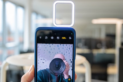 L'éclairage annulaire de la tenue Flashy est situé à l'arrière du smartphone et encadre la caméra du HMD Fusion. Je peux l'incliner à 180 degrés vers le haut pour éclairer mon visage tout en regardant dans la caméra frontale.