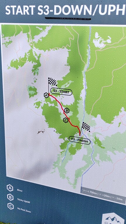 Sur les tronçons mesurés, il y a aussi des "No Feet Zones", où les pieds doivent rester sur les pédales. Ceux qui descendent malgré tout se voient infliger une pénalité de 10 secondes. Voici l'intégralité de la deuxième étape du point de vue du pilote, prise avec la caméra de mon casque: