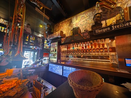 J’ai réalisé toute une série de photos dans un club de jazz. Dans l’ensemble, peu de lumière, mais aussi de grandes différences. L’objectif grand-angle a ici du mal à fonctionner, car la lumière du soleil éclaire l’image depuis l’extérieur. L’appareil photo principal capture bien l’ambiance, la lumière du jour près de la fenêtre et de la porte est naturelle et pas trop vive.
