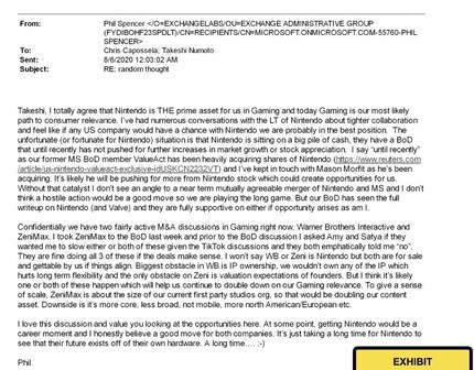 Microsoft voulait et veut toujours acheter Nintendo. Il ne s'agit pas de la tentative avortée d'il y a 23 ans, lorsque Steve Ballmer était encore à la tête de l'entreprise. A l'époque, les représentants de Nintendo s'étaient littéralement moqués de Microsoft . La proposition d'une entreprise commune, qui aurait permis à Mario et ses amis d'apparaître sur la Xbox, n'a manifestement pas convaincu le fabricant de jeux japonais. Dans le conflit avec la FTC, des projets d'acquisition beaucoup plus récents sont apparus. Le directeur de Xbox Phil Spencer écrit ainsi dansun mail d'août 2020 : "Nintendo est LA ressource la plus importante pour nous dans le domaine du jeu [...] malheureusement, Nintendo est assis sur un tas de liquidités [...].Je ne vois pas comment Nintendo et Microsoft pourraient fusionner à l'amiable dans un avenir proche et je ne pense pas qu'une OPA hostile soit une bonne idée, c'est pourquoi nous jouons la montre". Après le procès éreintant avec Activision Blizzard, Mario ne devrait pas sauter sur la Xbox avant un certain temps.