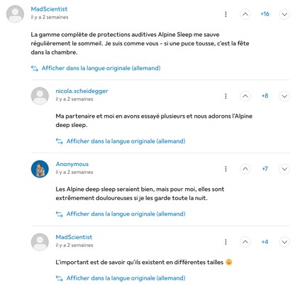 Terminons par le modèle à lamelles SleepDeep d’Alpine. Selon le fabricant, les SleepDeep coupent jusqu’à 27 décibels. Ce sont les bouchons les plus puissants de mon test, et aussi les préférés de la communauté Galaxus. Vous m’avez aussi conseillé de veiller à choisir la bonne taille.