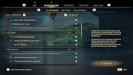 Als ik de persoon in het spel was, zou ik belangrijke aanwijzingen opschrijven in plaats van elke notitie bij te houden, hoe verwarrend ook. Als ik iets wilde begrijpen, zou ik mijn eigen aantekeningen moeten maken. Maar dat is precies waarom spellen quest logs hebben uitgevonden. Voor het laatste derde deel van het spel heb ik de moeilijkheidsgraad in alle drie de categorieën "Overleven", "Vechten" en "Ontdekken" op het gemakkelijkste niveau gezet. Dit vertelt me niet alleen welke aanwijzingen bij de hoofdzoektocht horen, het laat me ook de bestemming op de kaart zien.