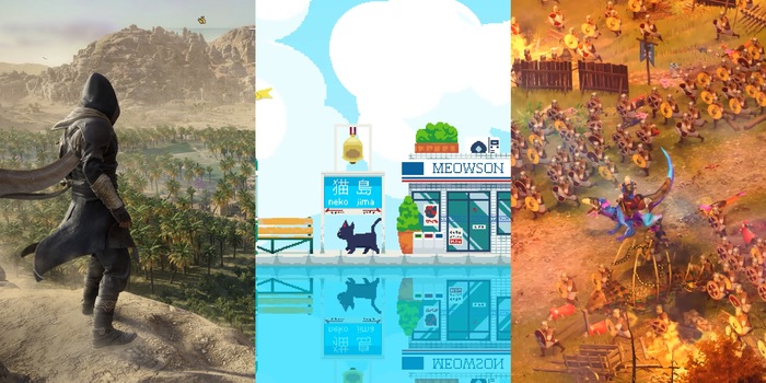Op de cover, van links naar rechts: «Assassin's Creed Mirage: Valley of Memory», «Cat Isle», «Dino Lords».