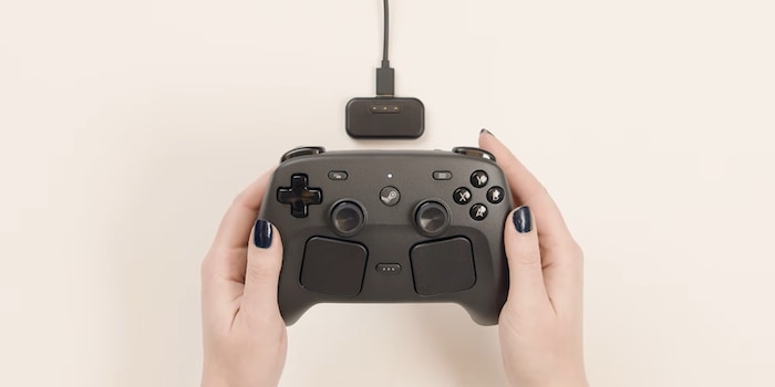 Het gevoel, de lange batterijlevensduur en het reparatiegemak worden ook benadrukt. De controller wordt opgeladen via USB-C of de meegeleverde puck. Deze dient ook als draadloze ontvanger voor maximaal vier controllers en wordt magnetisch aan de achterkant bevestigd.