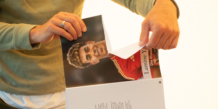 Als ik het boek in mijn hand heb, leg ik het snel weer neer. Ik blader het door en realiseer me: het is een flop. Na een kort voorwoord en vijf regels over «'s oorsprong en ouders», is er niet veel meer om een vierdeklasser aan te moedigen het te lezen. Ik heb genoeg tijd besteed aan het onderzoeken van beeldbanken om me te realiseren dat het ontwerp een heel eenvoudig principe volgt. Aan de rechterkant staat de foto, aan de linkerkant staat een korte beschrijving van de afbeelding, die de fotograaf moet invoeren. En zelfs dat werkt niet betrouwbaar. Naast een foto van Yamal in het shirt van FC Barcelona staat bijvoorbeeld: «Op de foto: Lamine Yamal 2023 tijdens de kwartfinales van het UEFA Europees kampioenschap U17.»