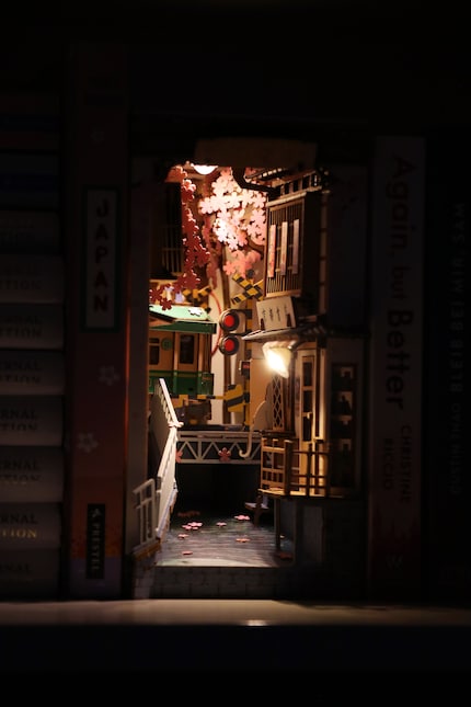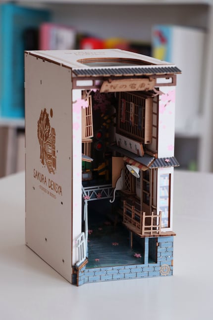 Ik lonk al een tijdje naar dit soort creatieve boekruggen. Nu heb ik mijn eerste ervaring opgedaan met de "Rolife Sakura Densya" set van Robotime, een modelbouwpakket. Het poortje neemt de kijker mee naar een Japan versierd met kersenbloesems en biedt uitzicht op een trein die een smalle rivier oversteekt.