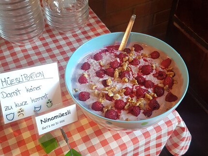 De bedden zijn snel opgemaakt en er is voldoende tijd om op het terras voor het diner te genieten van het adembenemende uitzicht - inclusief de Churfirsten. Het diner wordt geserveerd om 18.30 uur precies. De kinderen zijn dolblij. Na een pittige soep worden croissants met kaas belegd. Precies het ding na zo'n vermoeiende dag. Als dessert hebben we chocolademousse. Nou, ik denk dat het een mousse moest zijn. De consistentie ervan deed veel meer denken aan een cementmassa. Maar hé: wie wil hier zeuren? Ook al doet de moderne Zwinglipasshütte meer denken aan een berghotel, we zitten nog steeds in een SAC-hut op 2000 meter.