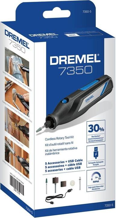 Omvang van de levering | 2x korundslijpstiften 15,9 mm, Bevestiging klauwbescherming, Dremel 7350-PET, Klemsleutel, USB oplaadkabel |